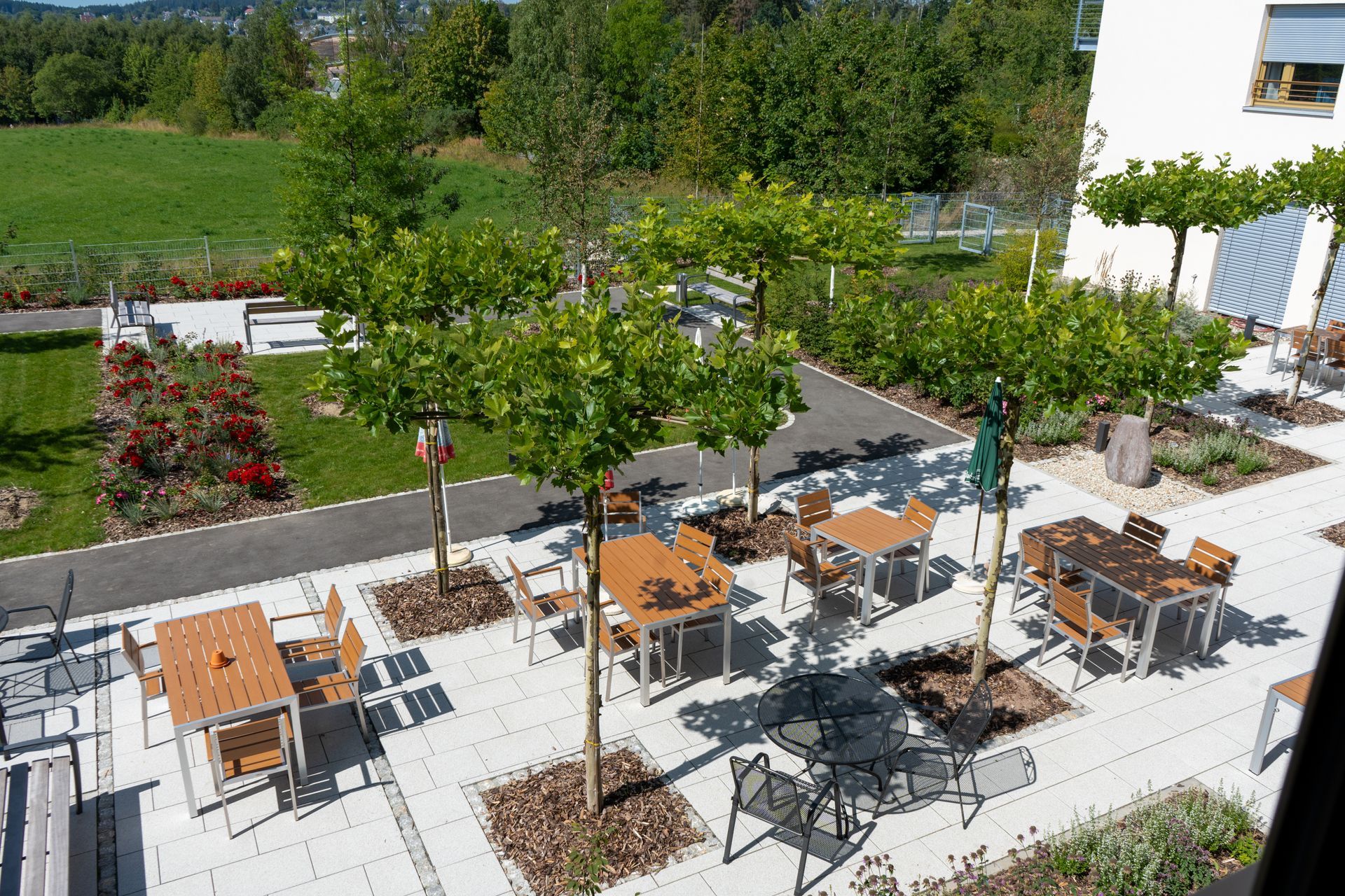 Unser Haus liegt ruhig am Stadtrand von Hof. Unser schöner großer Park lädt zum Spaziergang und Verweilen ein. Man schaut auf den bewaldeten Otterberg und in die reizvolle Umgebung bis in das Fichtelgebirge.